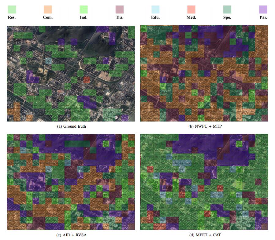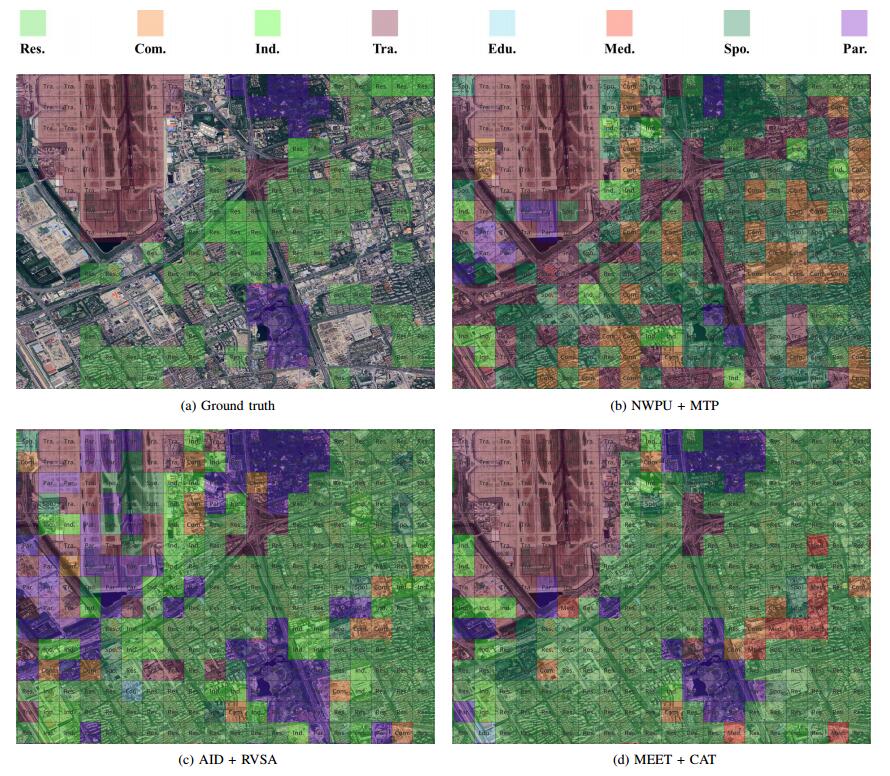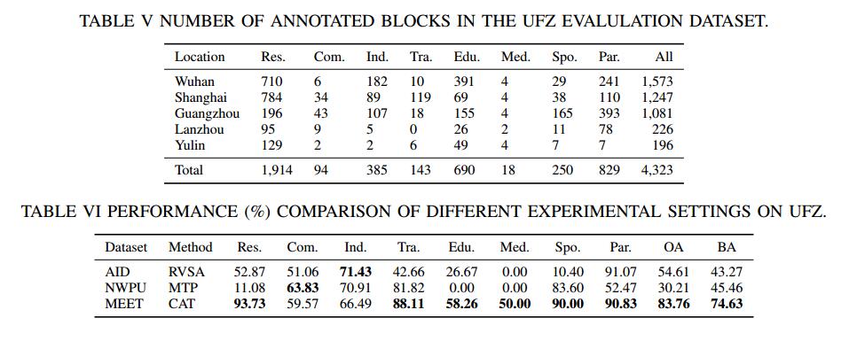 To validate the the setting superiority of the zoom-free characteristic and scene-in-scene sample layout of our MEET dataset, we conduct experiments on urban functional zone mapping (UFZ). In the pilot application, UFZ aims to predict the land-use category of each fixed-resolution RSI block and considers 8 land-use categories.