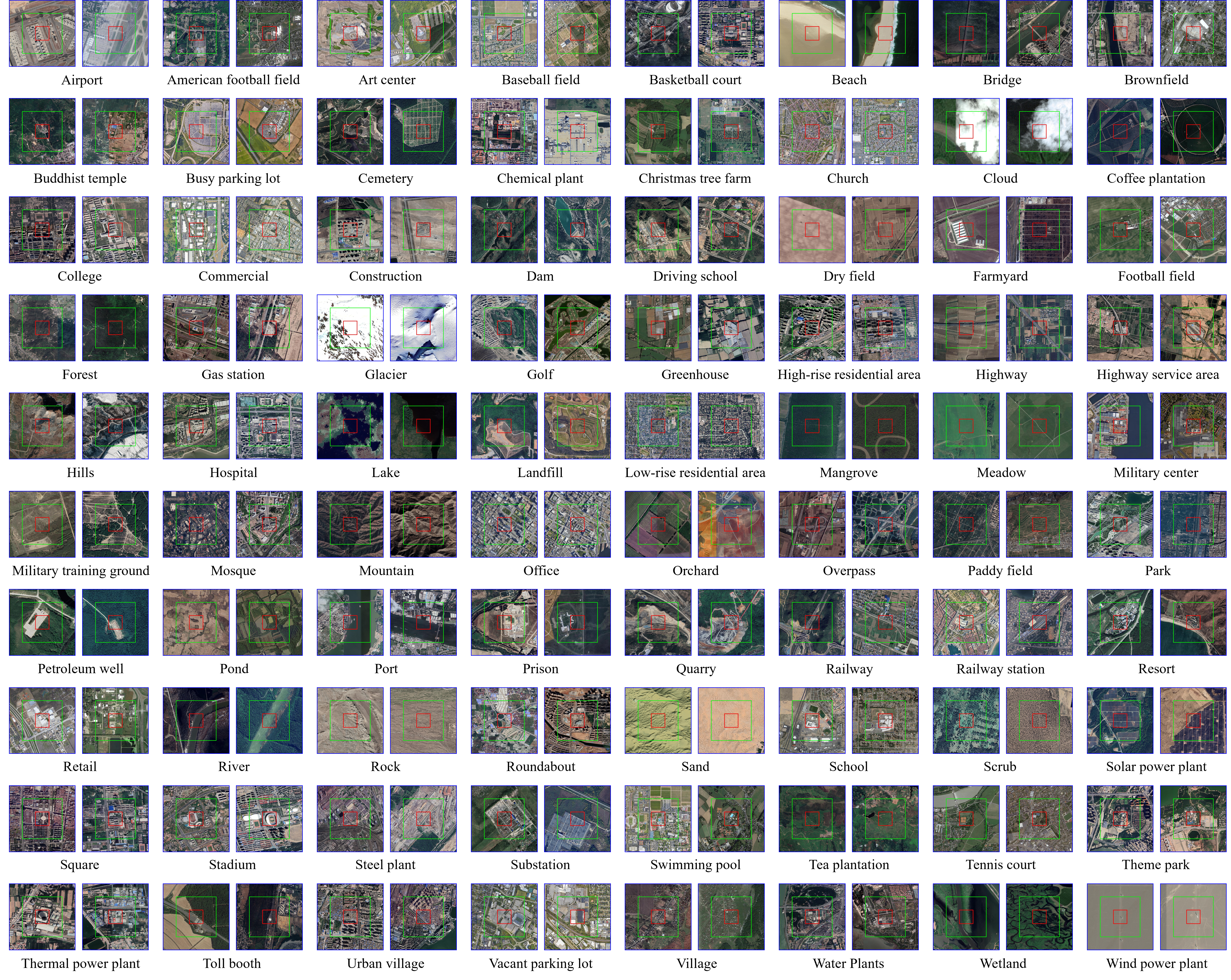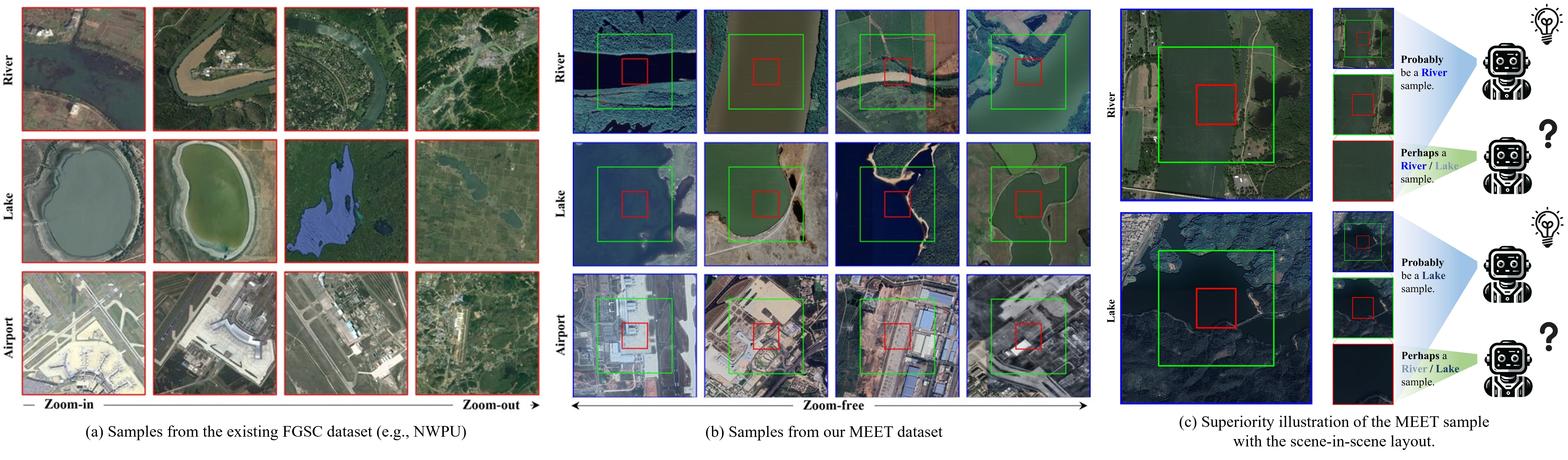 Fig. (a) shows that the existing FGSC dataset forms typical scene samples by manually zooming remote sensing images at different rates. In Fig. (b), the center scene outlined in red, is the basic unit for classification, while the surrounding scene outlined in green and global scene outlined in blue serve as auxiliary contextual images. With zoom-free samples and auxiliary scenes, MEET addresses inter-class and intra-class confusion in zoom-free image samples. Fig. (c) shows remote sensing image scene sample in MEET with the scene-in-scene layout. For the samples from first row and second row, models fail to predict the fine-grained scene category using only the center scene but has a great potential to obtain the right fine-grained scene category using both the center scene and the auxiliary scenes.