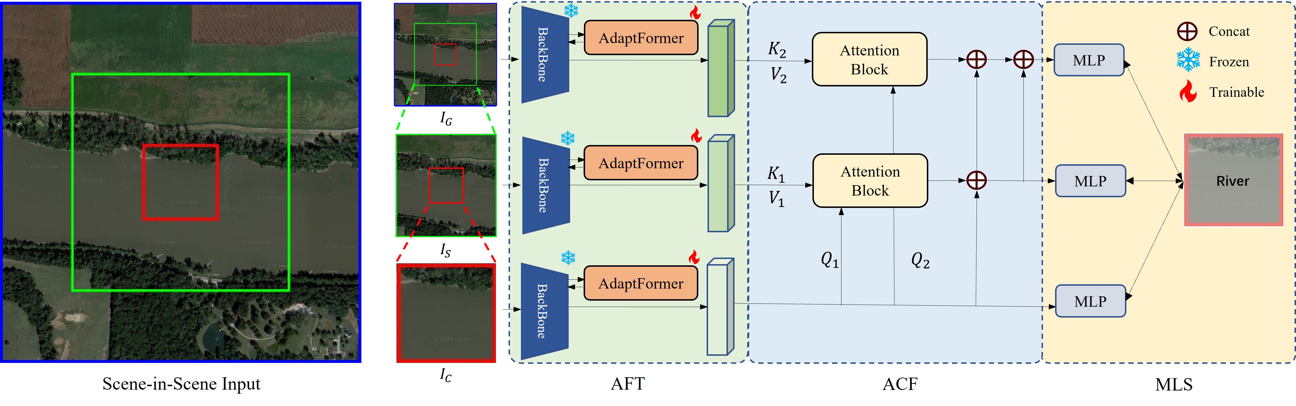 To flexibly and efficiently exploit the scene-in-scene layout in FGSC with zoom-free RSI, this paper introduces CAT, a novel approach specifically tailored for this task. CAT incorporates an adaptive context fusion module to effectively extract multi-scale contextual features from the transformer backbone. To ensure performance without excessively increasing parameters, we utilize parameter-efficient fine-tuning (PEFT) methods to finetune the backbone, instead of training from scratch or parameter synchronization. Additionally, we introduce multi-level supervision through independent classification heads during training. This improves feature learning at each level and mitigates overfitting that can arise from auxiliary scenes.